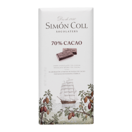 Chocolate 70% cacao 85g Simon Coll Fórmula 70% cacao. Elaborado con ingredientes naturales de gran calidad y fabricado siguiendo el proceso de selección y tostado tradicional del grano en nuestra fábrica Simón Coll.