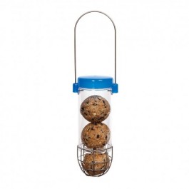Comedero de jardín para aves silvestres tipo tubular de JACOBI JAYNE. Con base, accesos y tapa de plástico resistente a la intemperie. Altura:190mm. Capacidad:3 bolas de sebo. Malla.