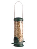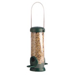 Comedero de jardín para aves sivestres tipo tubular de JACOBI JAYNE. Con base, accesos y tapa de plástico resistente a la intemperie. Se recomienda rellenar con mezcla de semillas GRANA-A y/o GRANA-S. Altura: 180 mm; Nº accesos laterales a la comida: 2; Capacidad: 0,5 l.