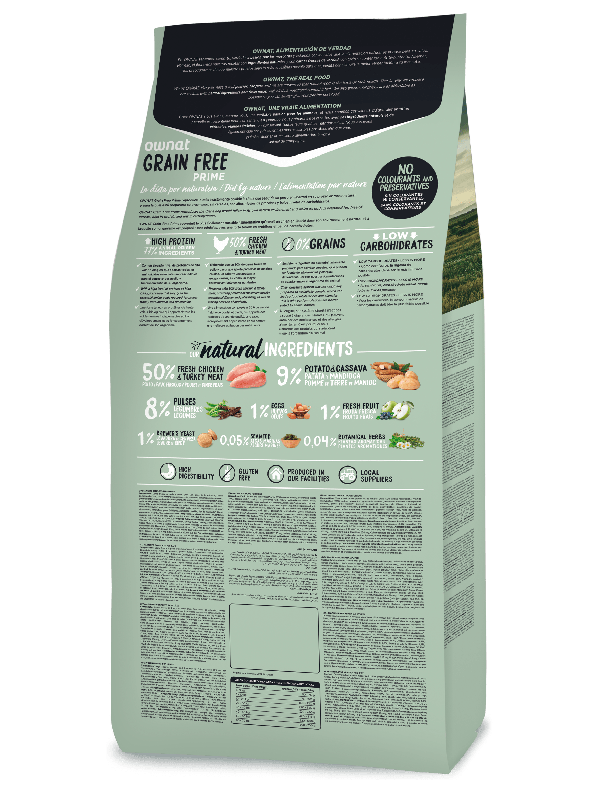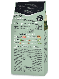 Carne deshidratada (34%), pollo fresco* (mín. 20% antes de la extrusión), guisantes enteros*, grasa avícola (preservada con antioxidantes naturales), raíces de mandioca*, patata deshidratada*, vaina de algarroba*, proteína hidrolizada de pollo, pescado deshidratado, levadura de cerveza*, pulpa de remolacha, manzana fresca* (1%), semilla de lino*, algas marinas deshidratadas*, sal gema*, aceite de pescado (preservado con antioxidantes naturales), fructo y manano oligosacáridos, alfalfa deshidratada*, glucosamina, condroitina, yucca schidigera, arándanos*, tomillo*, flor de manzanilla*, hinojo*, equinácea*, té verde*. *Ingredientes naturales.