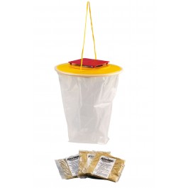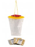 Bolsa de plástico, lista para colgar y preparada para atraer moscas en recintos exteriores. Permite que entren, quedando atrapadas.